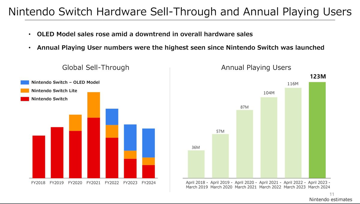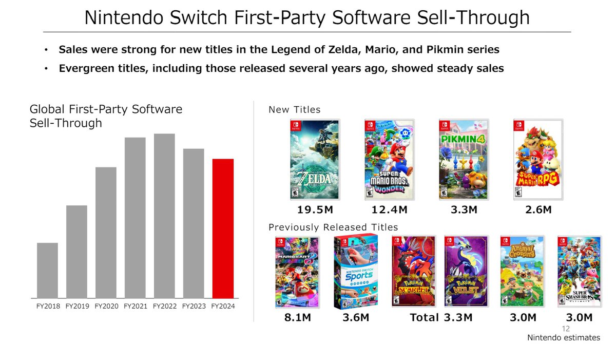 Количество проданных игр достигло 1.235 миллиарда, продажи постепенно падают — пик пришелся на 2022 финансовый год. Самой продаваемой игрой для Switch остается Mario Kart 8 Deluxe: реализовано почти 62 миллиона копий.