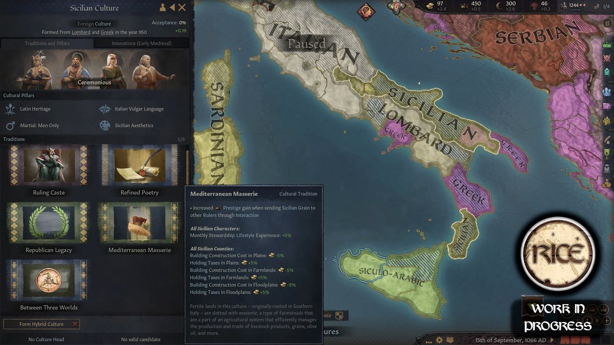 Сицилийско-арабская и сицилийская культуры с момента образования получат две новые традиции: "Между тремя мирами" и "Средиземноморская Массерия". Остальные культуры в регионе смогут их открыть. Сами традиции дают небольшие бонусы, но также связаны с новыми взаимодействиями.