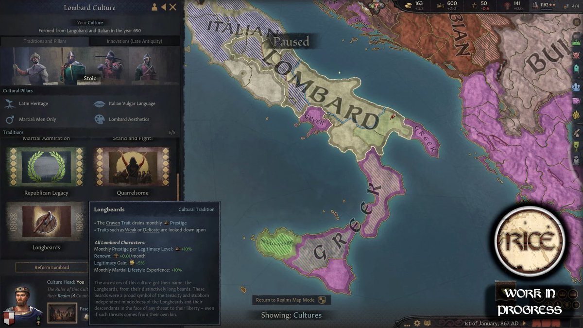 Regional Immersion and Cultural Enrichment - это модификация для Crusader Kings 3, которая улучшает колорит разных регионов карты в плане построек, решений, активностей, культур, религии, персонажей, а также новых использований системы борьбы.