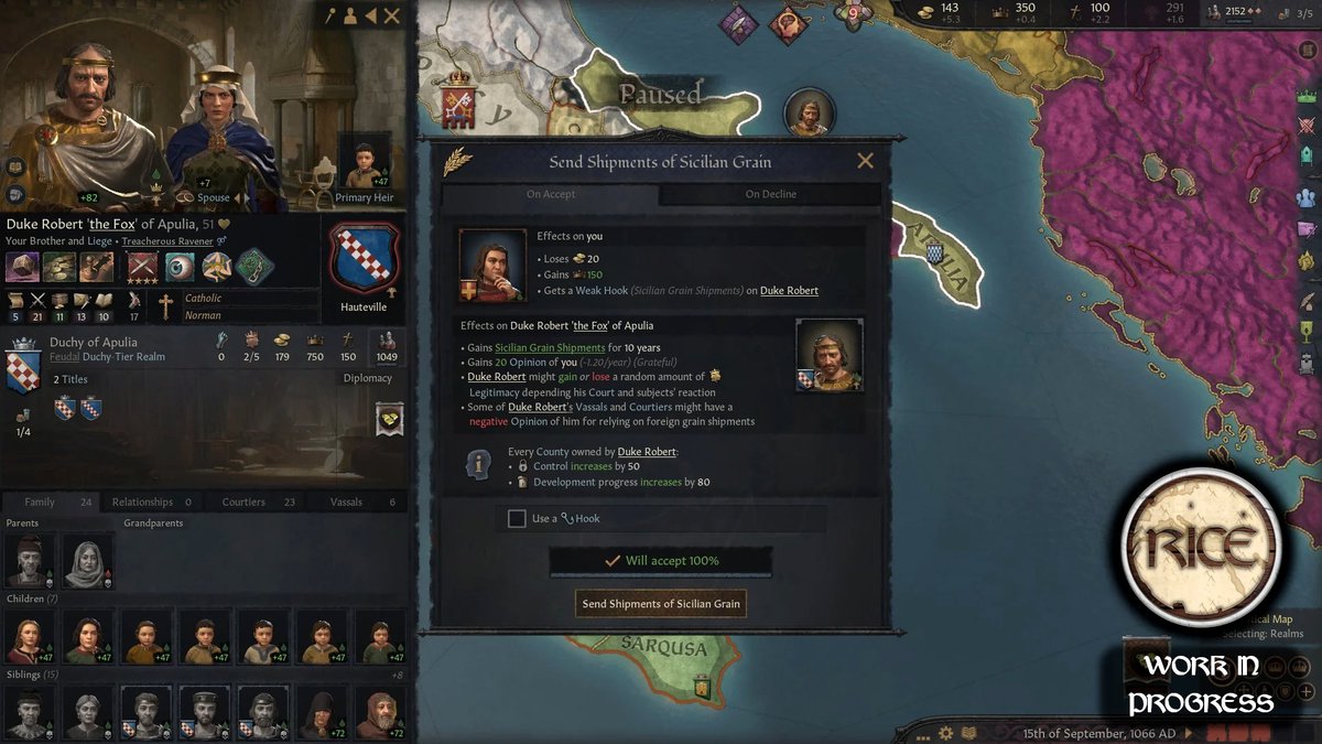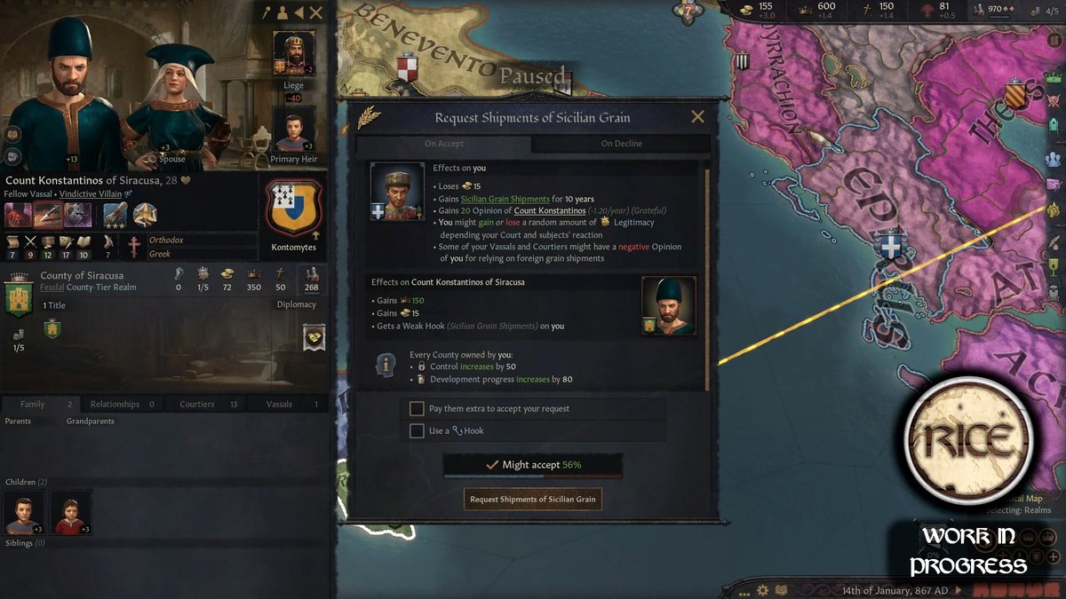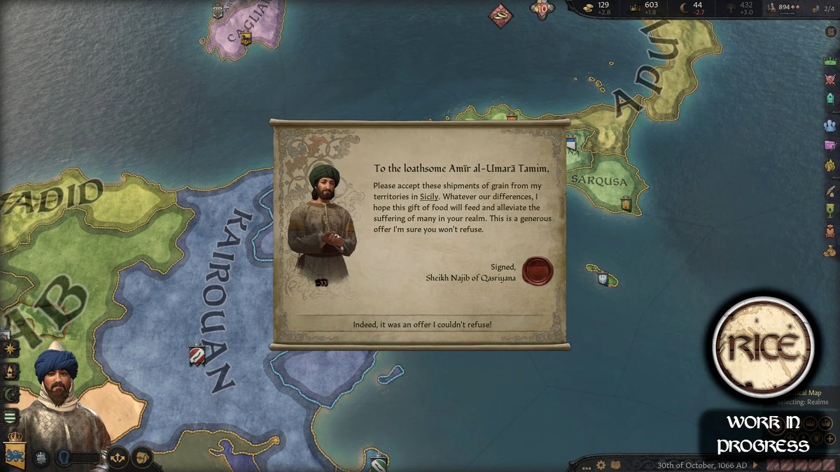 Остров Сицилия был известен импортом зерна оттуда. Любой правитель с владениями на острове сможет отправить продовольствие другому персонажу. У получателя повысится контроль, народное мнение, развитие. А вот реакция его двора может быть разной. Легитимность может как упасть, так и повысится, как и мнение его вассалов о своём сюзерене.