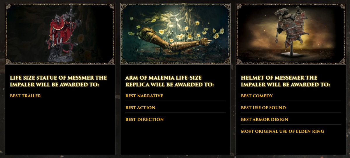 Участника конкурса предлагается создавать ролики, так или иначе связанные с Elden Ring. Ролики будут оцениваться в восьми номинациях:
