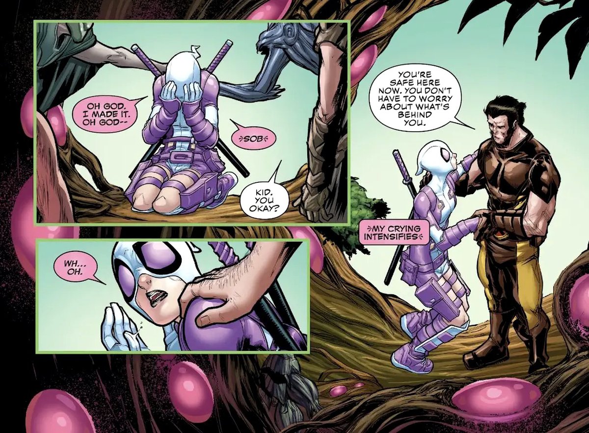 Лия: Мой искренний и беспощадный подход к этой мини-серии заключался в том, что мне нужно было «спасти» Гвен от того, чтобы её навсегда отложили на полку, поэтому решение привезти её на Кракоа было одновременно бюрократическим и практическим: превратить её в мутанта, поставить Гвенпул под контроль Икс-офиса. На мой взгляд, это давало ей неограниченное потенциальное будущее, которое нельзя отнять, несмотря ни на что.