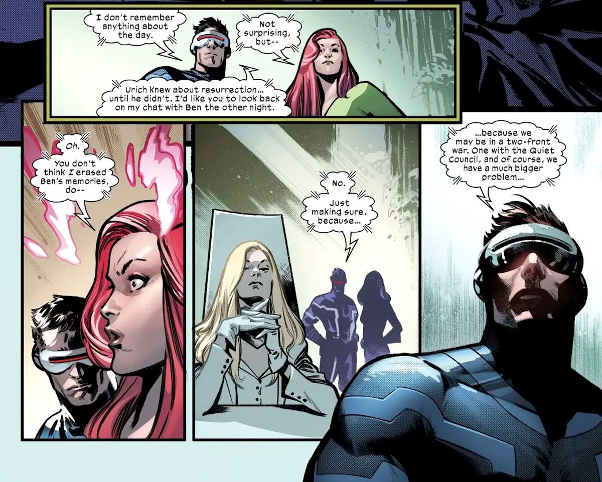 AIPT: Прекрасно. Дело закрыто. Затем фанаты Макс и Нико спросили: планировали ли вы написать историю, посвященную противостоянию Людей-Икс и Тихого Совета? В X-Men #7 Циклоп сказал, что они, возможно, ведут войну на два фронта — одну с Советом, а другую с Orchis.