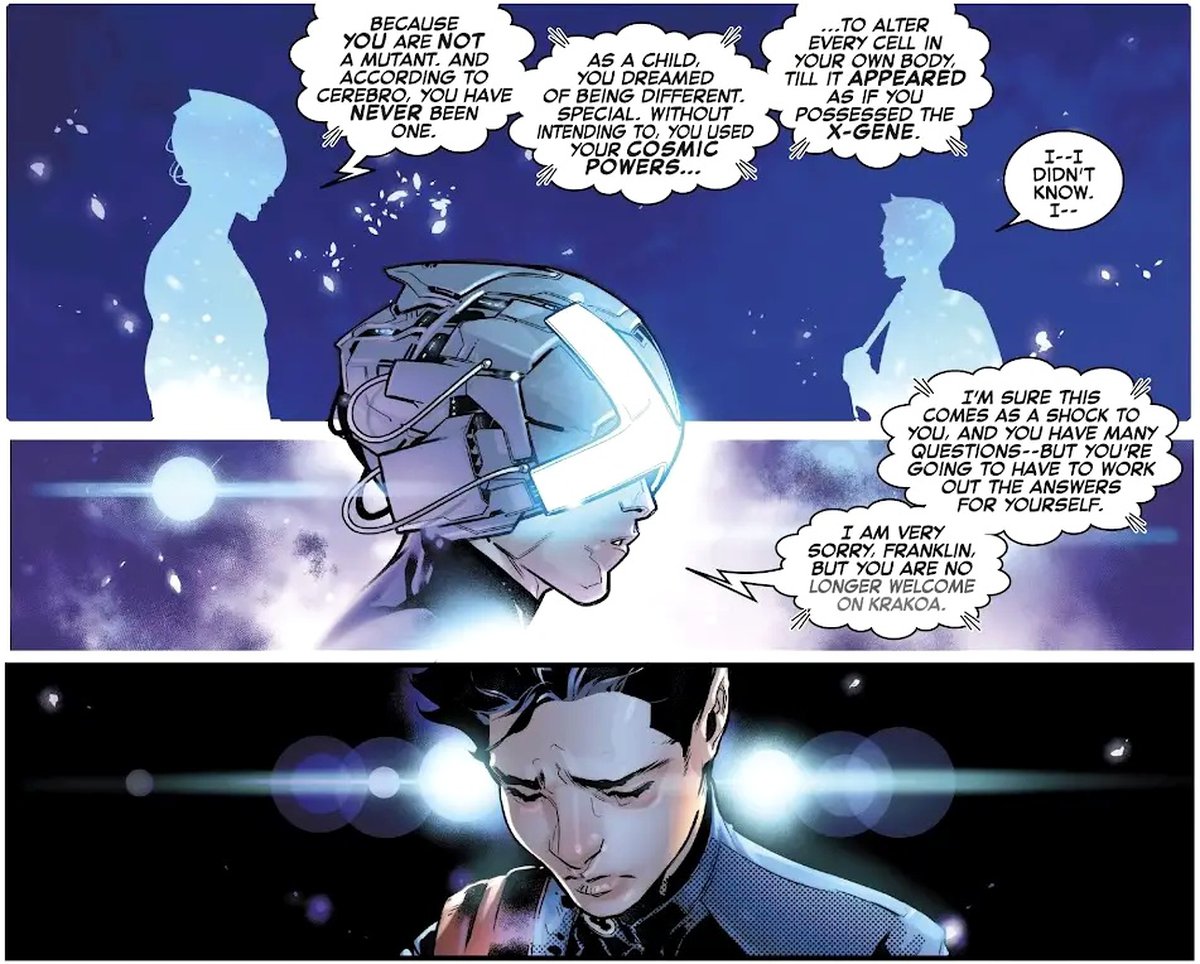 Джордан: 100%, тот же ответ. Абсолютно. Это не упущение, о котором так много говорится в первом выпуске House of X. Очевидно, что это персонаж, о котором Джонатан много думал и заботился о нём, когда писал про Фантастическую четверку. Так что он был на 100% прав, да, Франклин Ричардс - один из, если не самый могущественный, мутант всех времен. Очевидно, он станет важным игроком в истории мутантов и в том, что происходит с ними на общевидовом уровне.