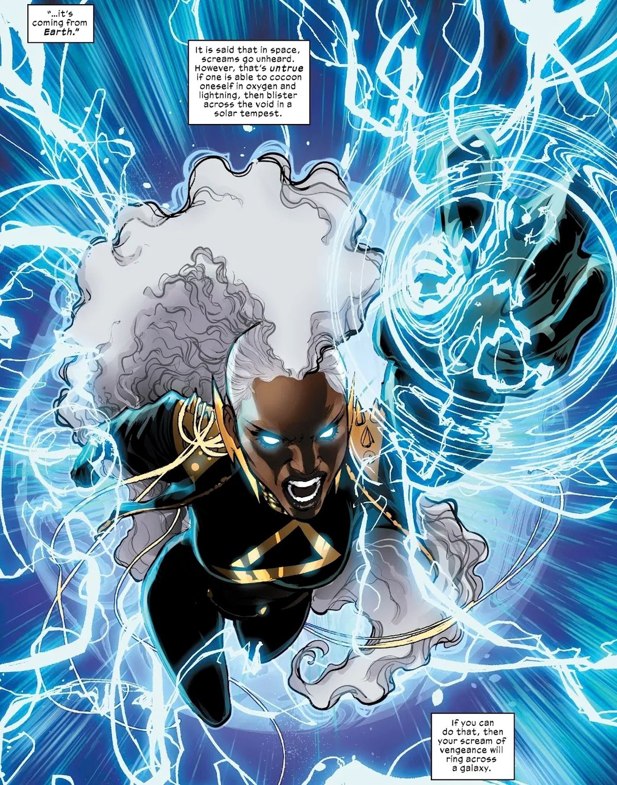 AIPT: Следующий момент появился совсем недавно, но, поскольку мы не разбирали его в обсуждении Fall of the House of X #4, я решил добавить его в микс. Фанат Reece спросил: Можете ли Вы объяснить, как быстро Гроза летела к городу сентинелов в Fall of the House of X #4? В комиксе Гроза упоминает, что использует солнечную бурю, проносящуюся по космосу. Она летела со скоростью света?