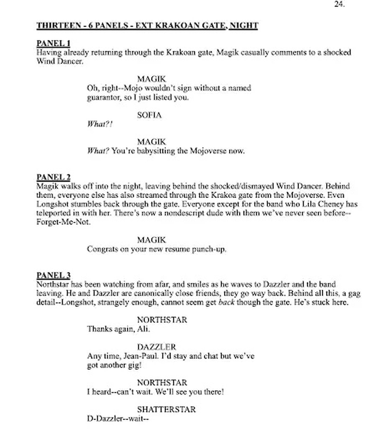 Лия: В X-Factor #9 можно увидеть появление Лонгшота, которое невозможно не заметить. У меня было больше планов на него с тех пор, как я работала над Моджовёрсом с Даззлер и Шаттерстар, но когда комикс был закончен, у нас закончилось время. Одна из идей, которую я имела для Лонгшота, заключалась в том, чтобы он снимался в версии «Холостяка» в стиле Моджоверс в роли… Холостяка. Но вот скриншот страницы сценария для страницы 13, выпуска 9, где он появляется – это должно помочь вам найти его: