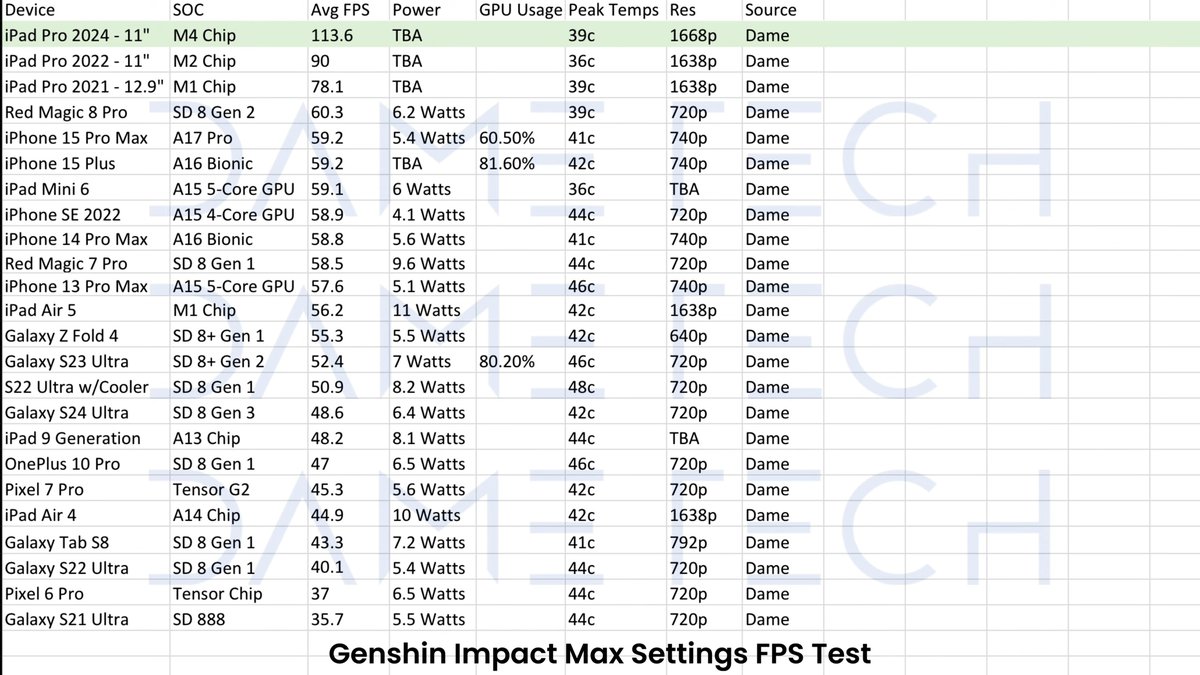 Apple выпустила первые устройства на базе чипа M4: он появился в двух версиях планшета iPad Pro. Канал Dame Tech протестировал планшет с чипом M4 в Genshin Impact и сравнил производительность с другими мобильными устройствами.