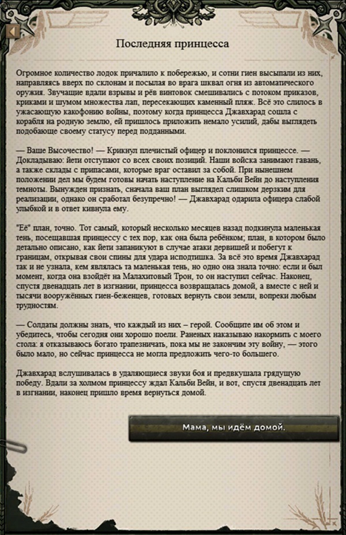Скорее всего, в условиях собственной гражданской войны тандарийцы будут вынуждены отдать украденные земли гиен и отступить, подписав белый мир с дервишами, чтобы сосредоточиться на борьбе со своими собратьями-йети.
