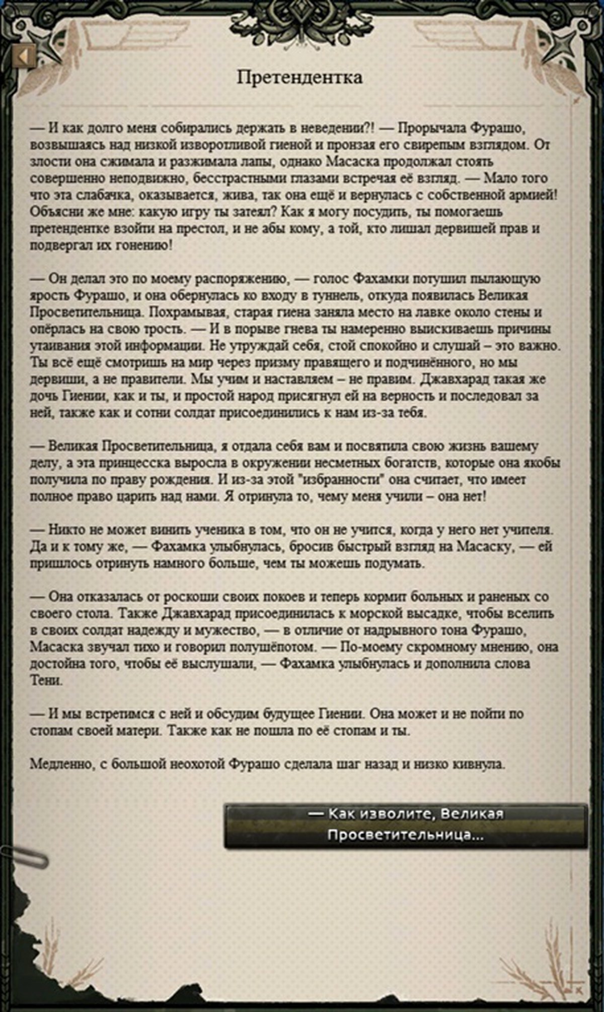 Да и Великая просветительница может быть матриархом и авторитетом для дервишей, но не осмелится взвалить на себя всю ответственность за Гиению и её развитие. Когда война выиграна и воцарился мир, Фахамка строит планы по встрече с вернувшейся принцессой для предотвращения возможной гражданской войны сразу после долгожданной победы. Вот только не все лидеры освободительной армии с этим согласны.