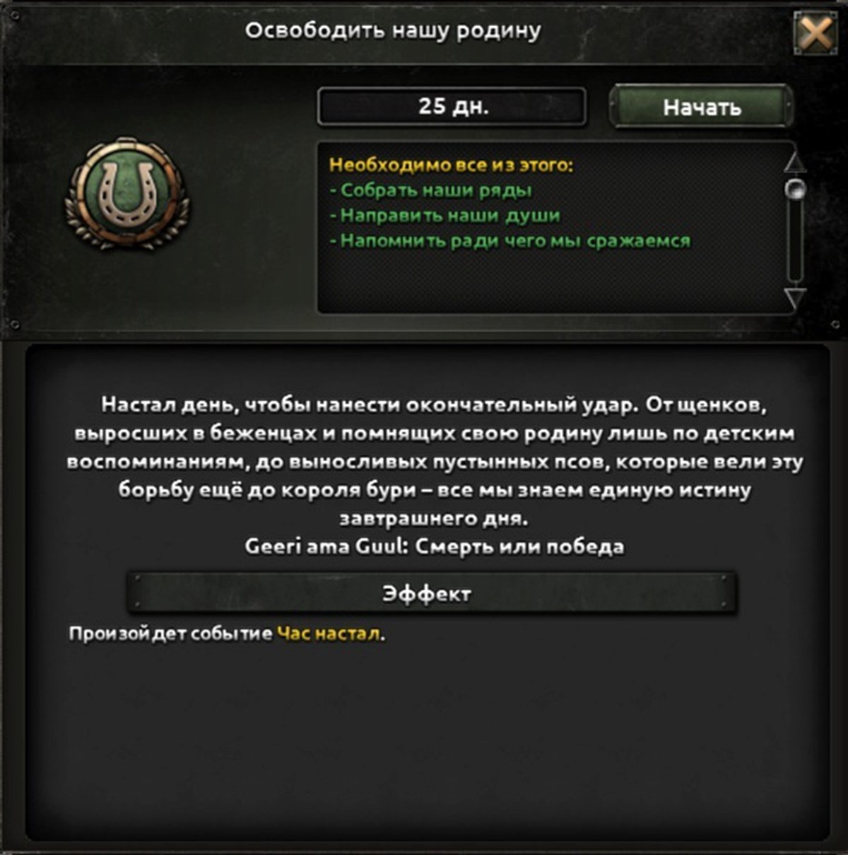 Большая часть фокусов сосредоточена на завоеваниях, улучшении своей армии и интеграции завоёванных территорий. Хотя также будут фокусы, посвящённые какому-то развитию общества и заключению оборонительного пакта со странными лошадками по соседству.
