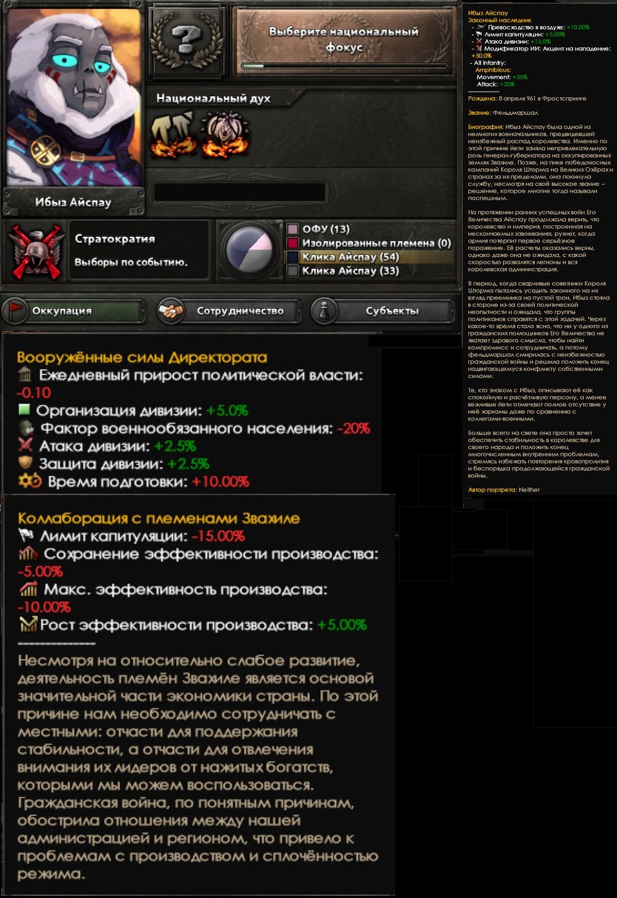 Ибыз будет стремиться укрепить силы своего гарнизона-государства, одновременно заключая сделки с местными зебрами и улучшая слабую промышленность, которая крайне необходима для победы в гражданской войне. У стартового древа фокусов есть дополнительные ветки, в которых можно получить бонусы в обмен на стабильность. Например, создание штрафбатов из зебр или массовая отправка их на заводы.
