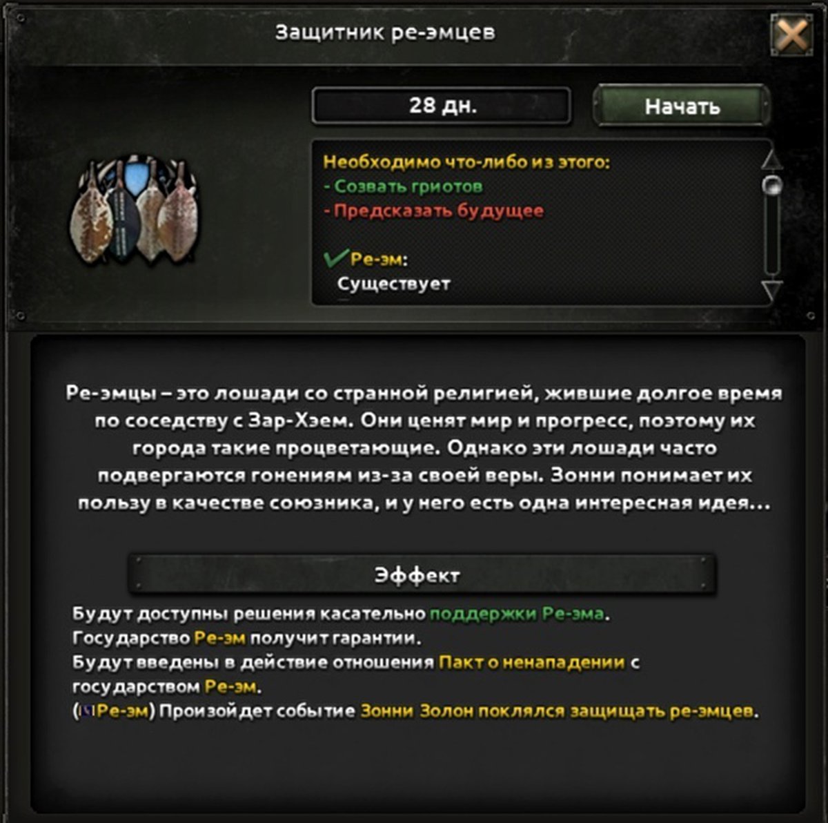 Лошади Ре-эм миролюбивы и могут похвастать относительно развитым обществом. Многие ре-эмцы живут в небольших анклавах, разбросанных по всем Великим Озёрам. У них можно получить культурно-просветительскую помощь, но их надо защищать. Ниже представлена целая группа решений.