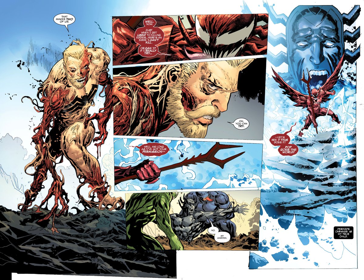 Выманить не получилось, зато Карнаж как-то с помощью Брока-сына пролез в то самое будущее, где все версии Эдди как раз собрались. Карнаж взял и разнёс Сад Времени, в который Меридиус закатал всех симбиотов в конце времён. Что там осталось по итогу, неясно пока.