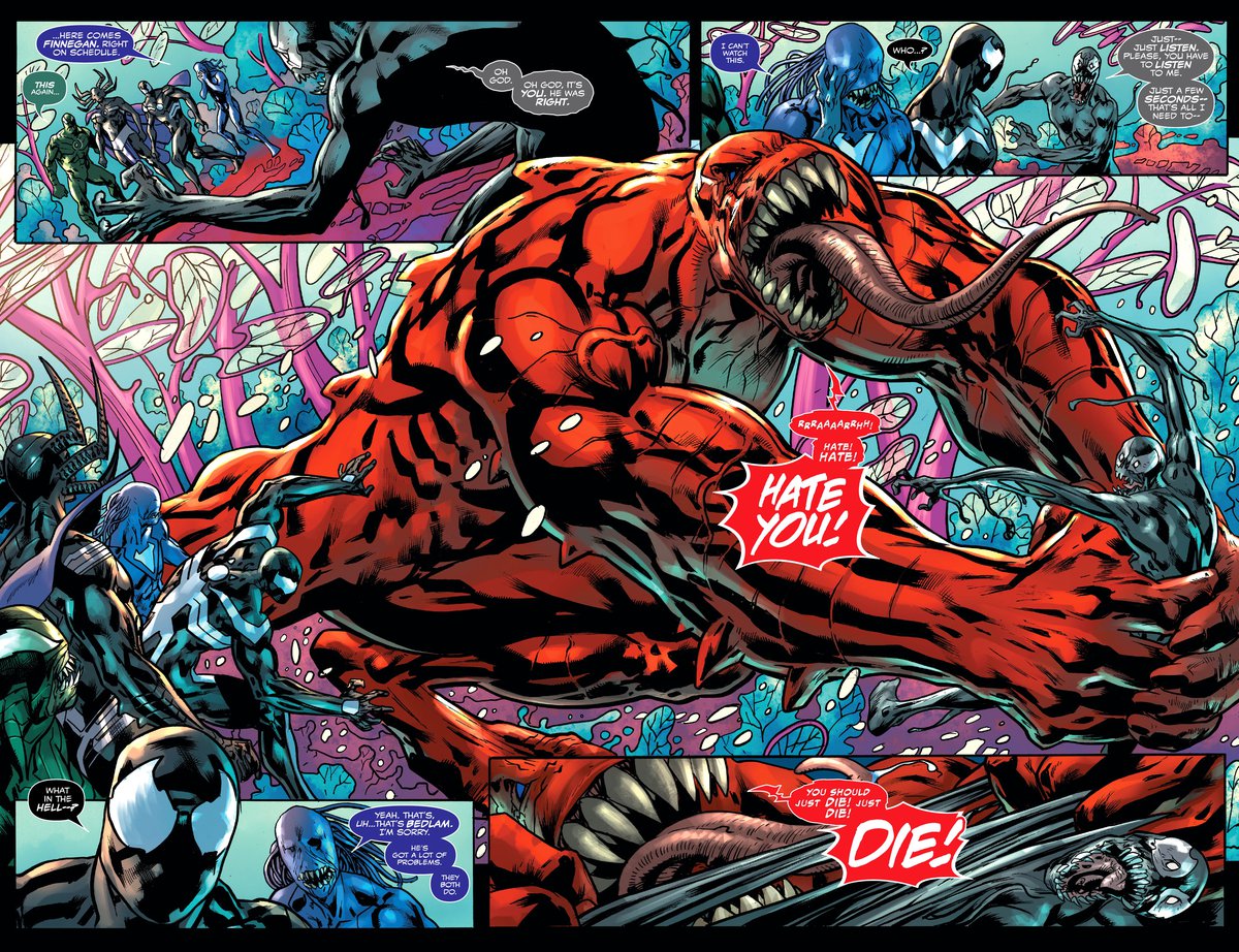 Дилан начал набирать свою армию симбиотов: Красного гоблина, Чёрную вдову, Слипера, а также Флекс-О. У Эдди есть версии себя и носящий Анти-венома Флэш Томпсон. И вот тут мы возвращаемся к арту грядущего события "Война Венома". Его уже давно показывали, но благодаря всей этой предыстории лучше понятно, что вообще происходит.