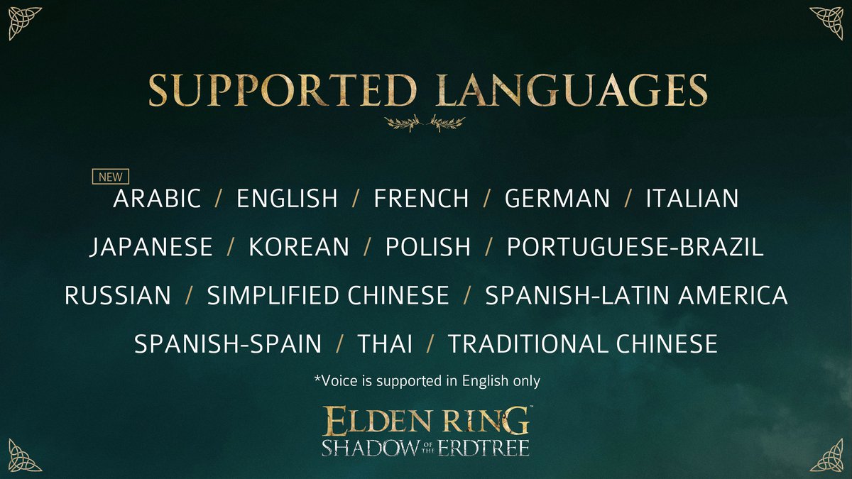 Разработчики обращают особое внимание на появление в списке поддерживаемых языков арабского. На релизе Elden Ring не получила арабскую локализацию; видимо, теперь на арабский переведут и дополнение, и базовую игру.