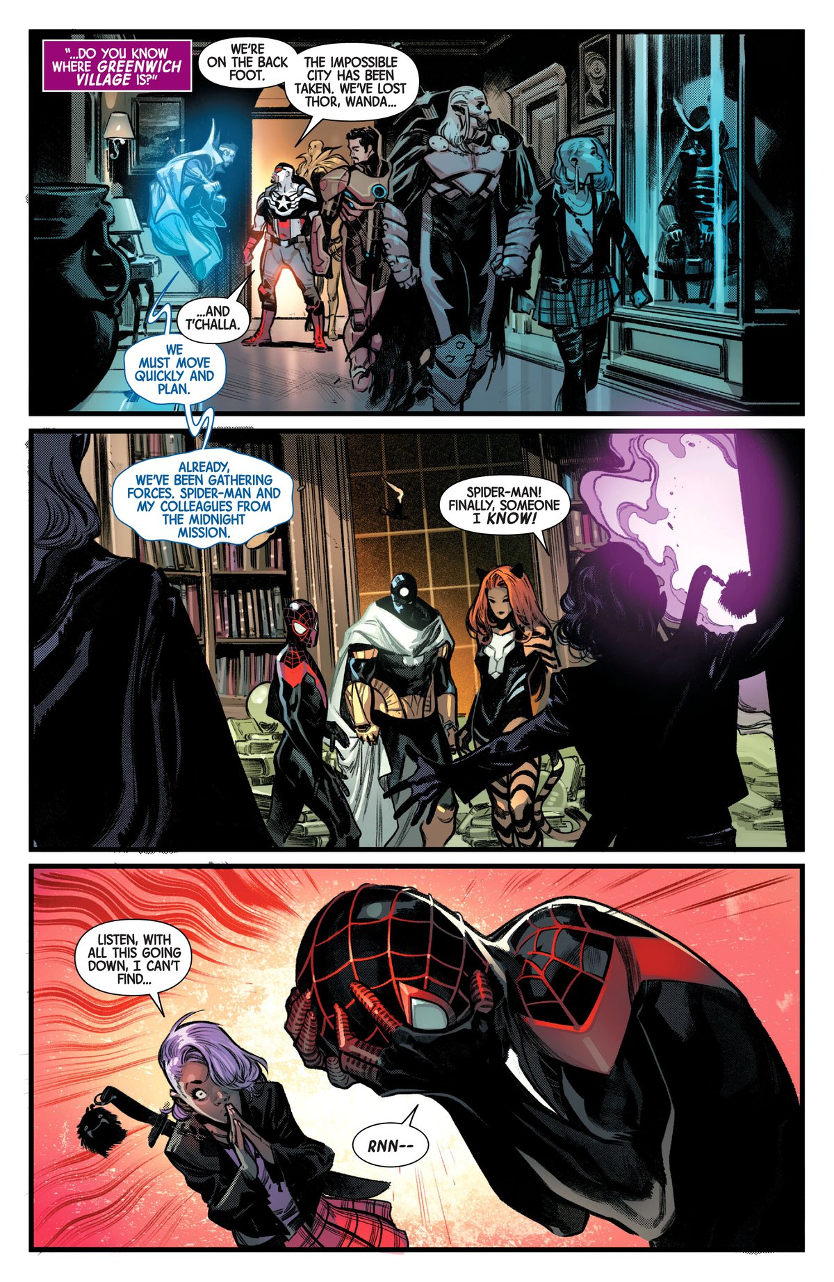 Некоторые персонажи начали стекаться к Санктум Санкторуму, дому верховного колдуна Земли. Это место считалось одним из самых безопасных. Даже то, что физическое тело Стрэнджа стало вампиром не страшно, жена удержит его заклинаниями. И тут внезапно оказалось, что Майлз Моралес, прибывший сюда с группой, тоже вампир.