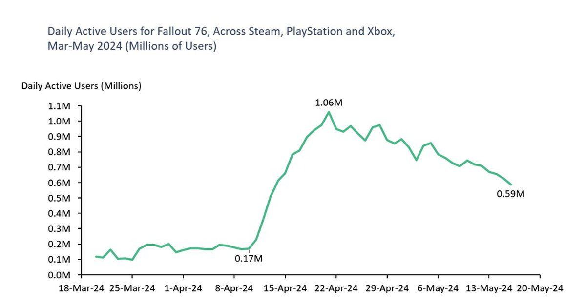 С Fallout 76 ситуация выглядит интереснее. До выхода сериала ежедневный онлайн в игре на всех платформах оценивался примерно в 170 тысяч человек, премьера Fallout повысила этот показатель до 1 миллиона игроков.