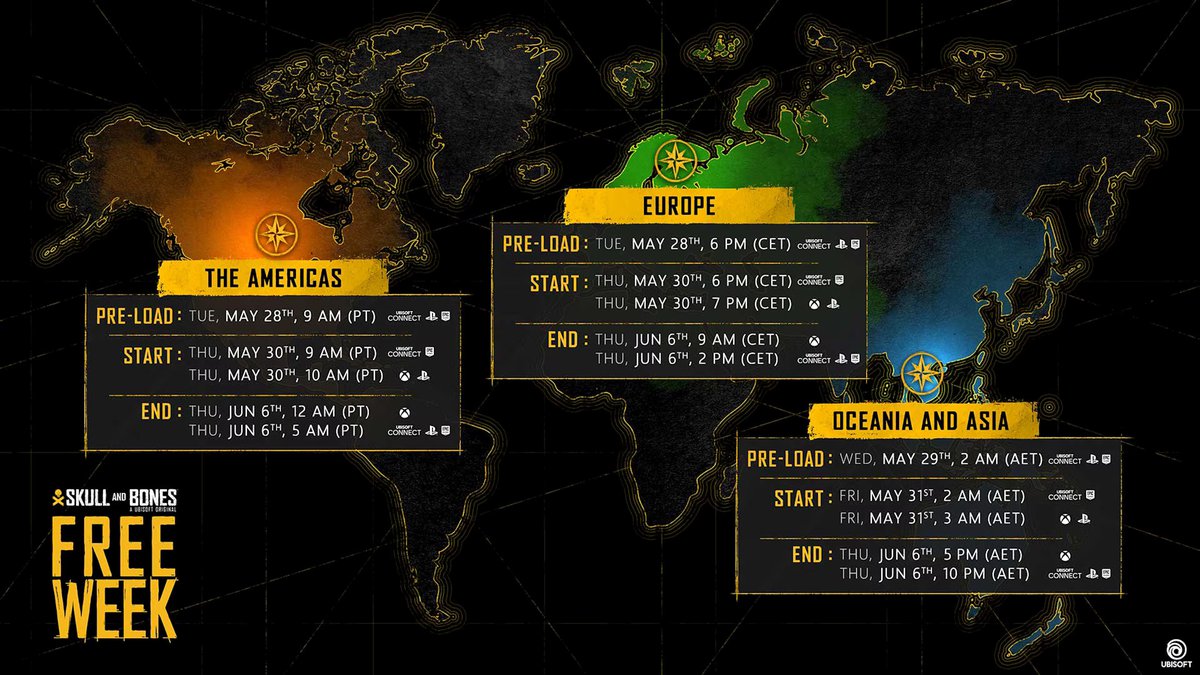 28 мая, сразу после старта сезона, будущие игроки смогут предзагрузить клиент Skull and Bones. Разработчики не уточнили, почему бесплатная неделя стартует с задержкой и сперва доступ к новому сезону получат только владельцы игры.