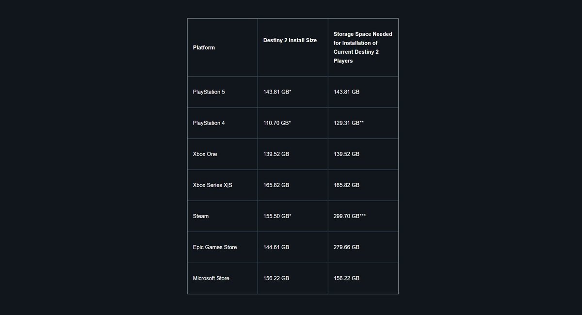 Скорее всего, необычно большие объемы свободного места у версий для Steam и Epic Games Store связаны с особенностями упаковки данных в Destiny 2 на PC. Видимо, игрокам на PC будет проще не ставить дополнение поверх установленной игры, а удалить Destiny 2 и поставить с нуля уже с дополнением.