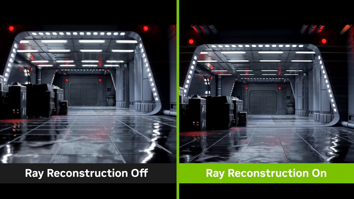 Реконструкция лучей, работающая только на видеокартах Nvidia семейства GeForce RTX, заменяет стандартные алгоритмы шумоподавления. Благодаря использованию реконструкции частота кадров при обсчете трассировки лучей будет выше, качество трассировки тоже повысится.