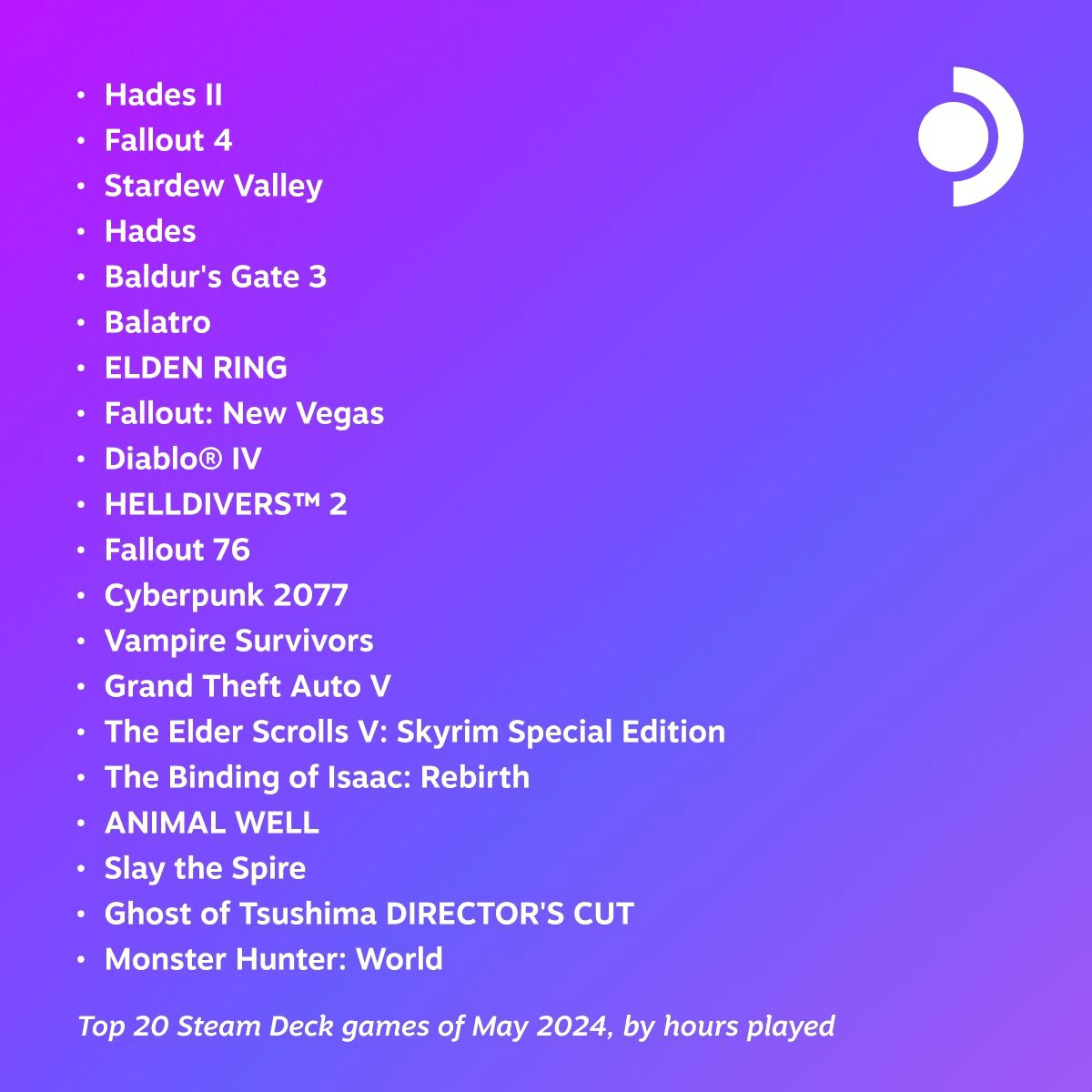 Valve опубликовала список игр, пользовавшихся у владельцев портативной консоли Steam Deck наибольшей популярностью в мае 2024 года. Топ возглавил роуглайк Hades 2, вышедший в раннем доступе.