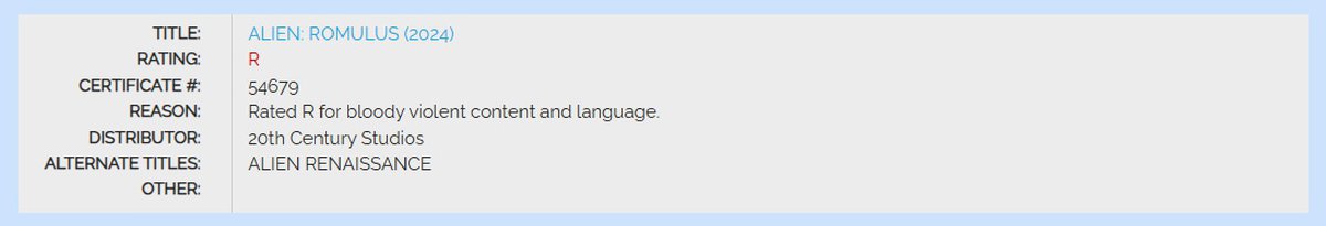 Фильм «Чужой: Ромул» будет выпущен с рейтингом R, сообщает Film Ratings со ссылкой на данные MPA. Это было ожидаемо: все части «Чужого», выходившие с самого запуска франшизы, получали именно рейтинг R.