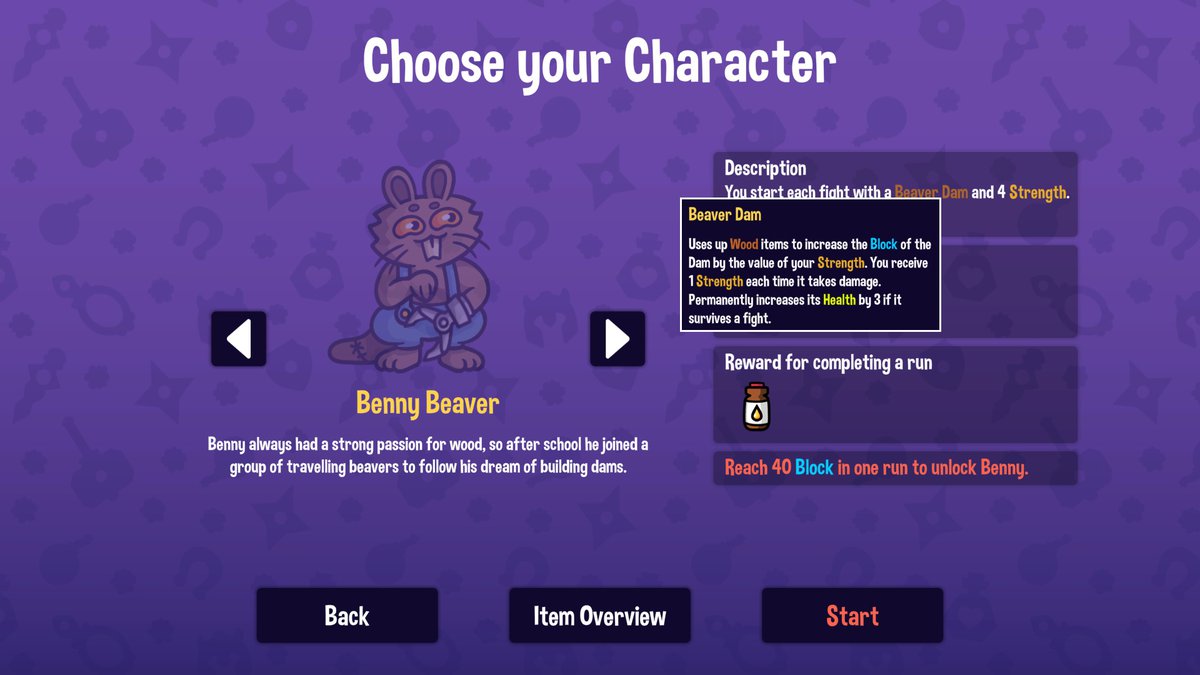 У бобрика Бенни, другого открываемого персонажа, будет защитная дамба, в которую враги станут бить в первую очередь. Подбор деревянных предметов должен её защиту повышать, а вражеские атаки по ней увеличат силу героя. А если эта плотина ещё и до конца сражения доживёт, то её максимум здоровья на 3 повысится.