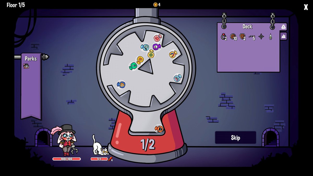 Комната, в которой ранее подбирались зелья лечения или перки, теперь разбита на две отдельные. Перки теперь подбираются в колесе. Запускается оно бесплатно и крутится. Как только вниз выпадут два мешочка, игроку предложить выбрать один из этих двух перков.