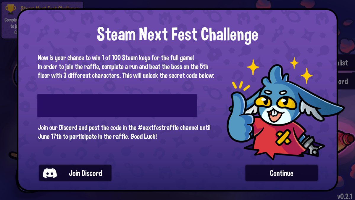Имеется награда и куда более серьёзная. Если пройти 5 этажей за хотя бы трёх разных персонажей до конца фестиваля, то откроется специальный код в окошке, вызываемом в левом верхнем углу главного меню. Код потом нужно будет вписать в специальный канал на Discord-сервере разработчиков. 100 человек из тех, кто это сделают, получат ключи к платной версии игры. Она, правда, в раннем доступе выйдет только в третьем квартале этого года по текущим планам.