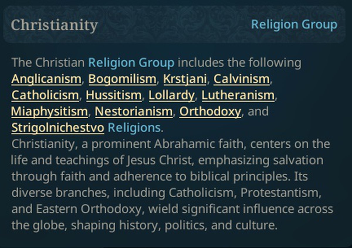 Некоторые религии получат уникальные механики. Например, православие, католичество, миафизитство, разные протестантва, варианты ислама, буддизм, синтоизм, индуизм, а также веры ацтеков и инков. В любом случае у каждой религии будут особые модификаторы, т.е. бонусы или штрафы. Например, джайнисты не смогут объявлять войны без повода, а кальвинисты перебрасывать кубик в битвах.