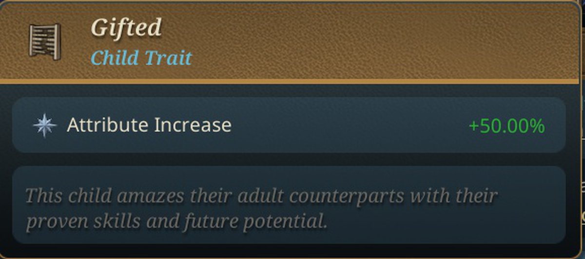 Ещё будут у персонажей разные черты, которые повлияют на статы и не только. В пример приведена черта особо одарённого, которая повышает шанс для наследника стать жертвой несчастного случая на охоте. По ходу игры герои смогут заработать до трёх черт.