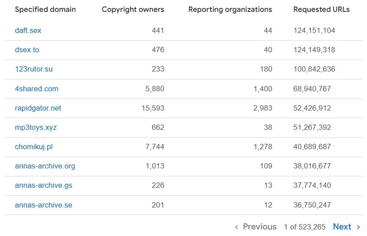Сейчас домен трекера занимает третье место по числу поступивших запросов: их чуть меньше 101 миллиона. Другими словами, в среднем Google ежедневно получает около 275 тысяч DMCA-запросов, связанных с этим трекером.
