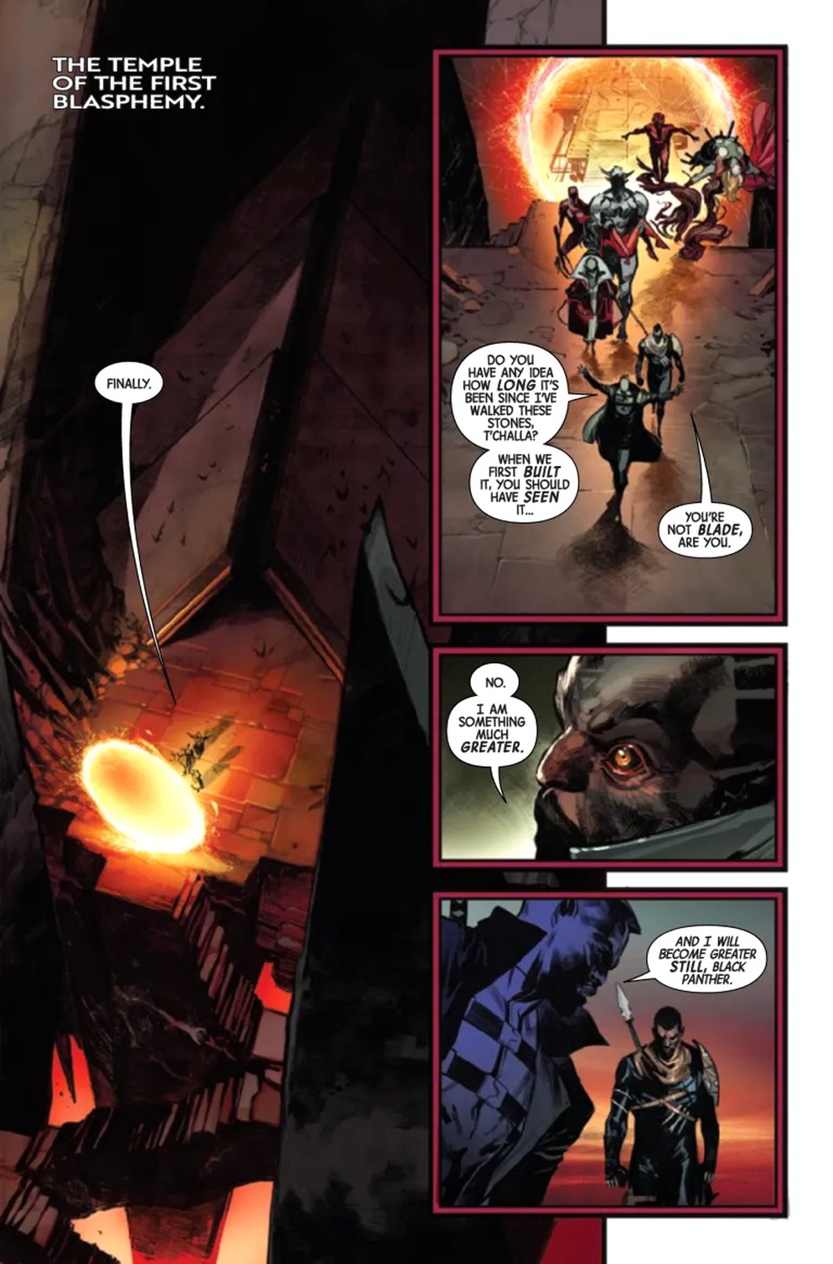 Вампиры идут по Храму, Пантера отмечает, что их лидер не Блэйд, а тот не спорит и собирается стать ещё чем-то большим. Ожидается битва Ковена и Мстителей.