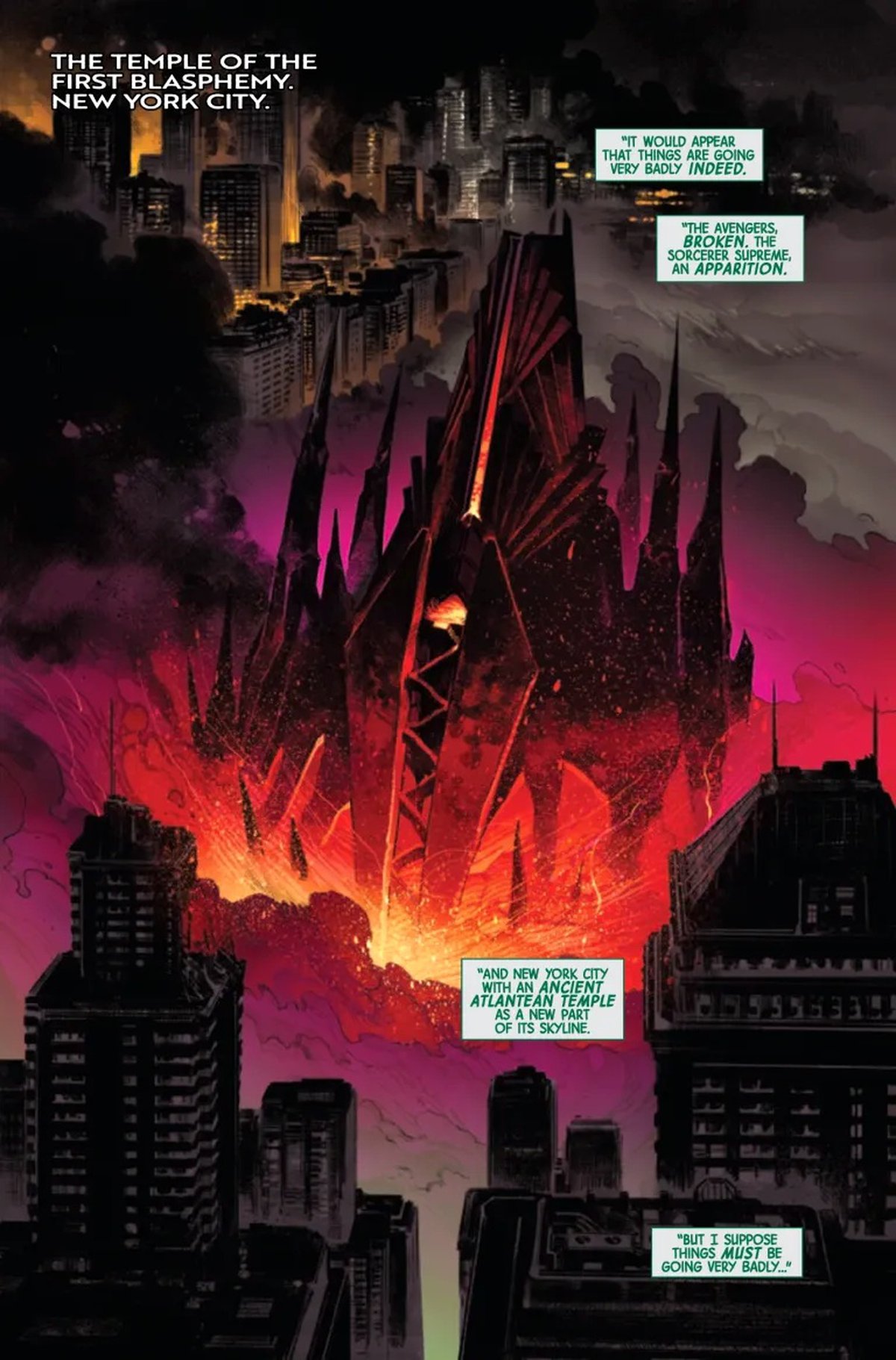 Переходим к превью. Ранее вампиры захватили базу Мстителей - Невозможный город. С его помощью Блэйд телепортирует в Нью-Йорк атлантийский Храм Первого Святотатства. Судя по всему, именно в нём появились первые вампиры. Эту древнюю штуку добыл Т'Чалла из-под Ваканды, в том и был смысл его обращения.