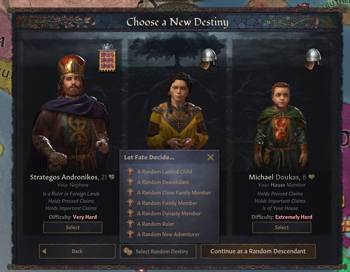 В патче 1.12.5 добавляли возможность играть не за основного наследника после смерти героя. Теперь ещё и разнообразные кнопки случайного выбора завезут. После смерти можно будет понадеяться на удачу и переселиться в случайного правителя, ребёнка, члена династии, приключенца, члена династии.