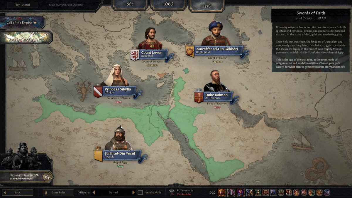 Известный император Священной Римской Империи Фридрих I Барбаросса помер в 1190 году, значит, чтобы дать за него играть, надо выбрать что-то пораньше. В это время существовало Иерусалимское королевство, которым заправлял Балдуин IV.