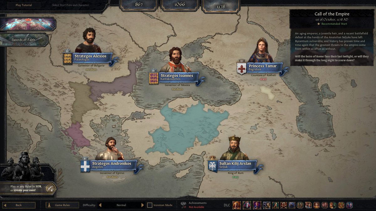 В посте приводятся ещё несколько подобных героев. Но лучше пока рассмотрим персонажей, предлагаемых игрой в 1178 году. Раздел "Зов Империи" посвящён Византии, но императора в списке нет, Мануилу I Комнину осталось жить пара лет.