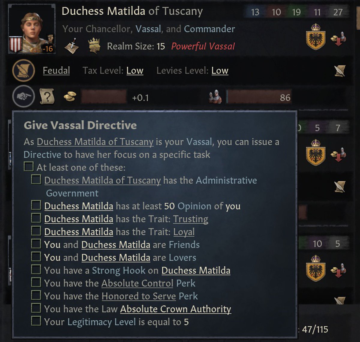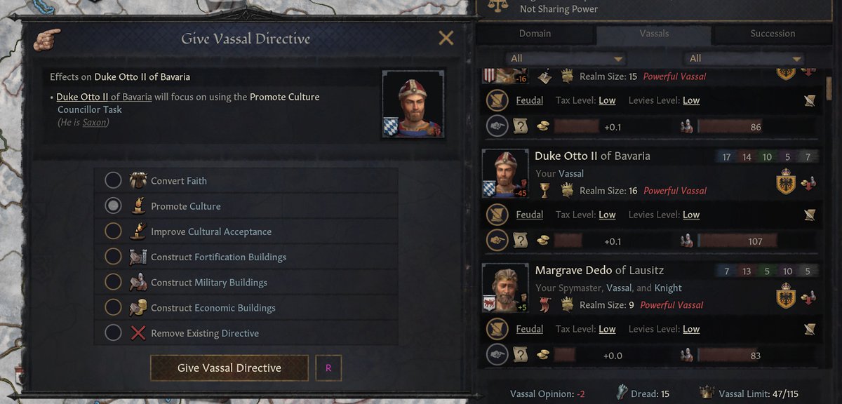 Следующая фича - задачи для вассалов. Хотите, заставляйте подчинённых строить крепости, насаждать культуру, веру, развивать экономику или ещё что-нибудь.