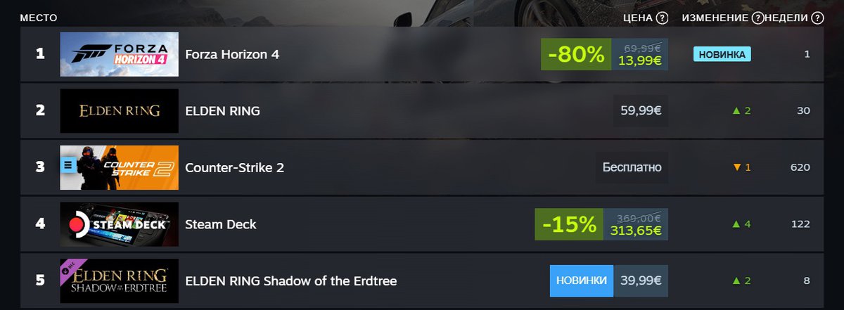 Прямо сейчас гоночный экшен Forza Horizon 4 возглавляет мировой чарт Steam, обходя Elden Ring и другие популярные игры. Популярность Forza Horizon 4 объясняется большой скидкой: игру распродают перед снятием с продажи.