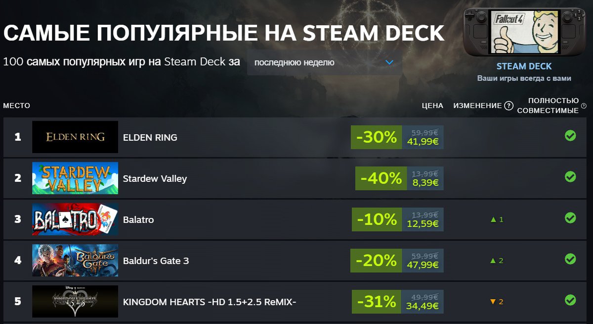 Чарты обещают обновлять ежедневно. Помимо места игры в топе, ее цены и скидки (если она есть) в чарте показывается степень совместимости игры со Steam Deck. Отсутствие полной совместимости не помешало GTA 5 попасть в топ.