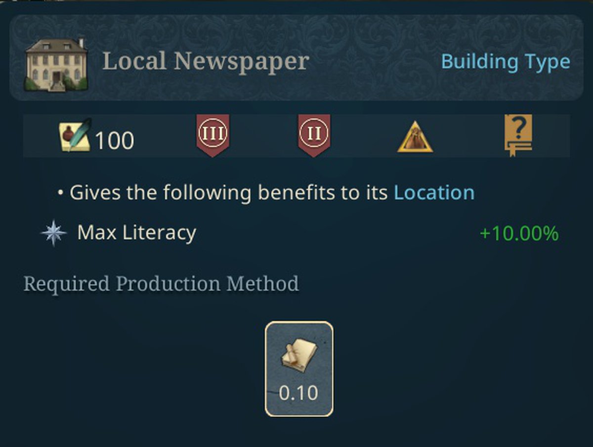 При свободной прессе, горожане будут делать сооружения местных газетёнок, которым потребуется бумага для работы. В эффектах здания сказано о повышении грамотности на территории.