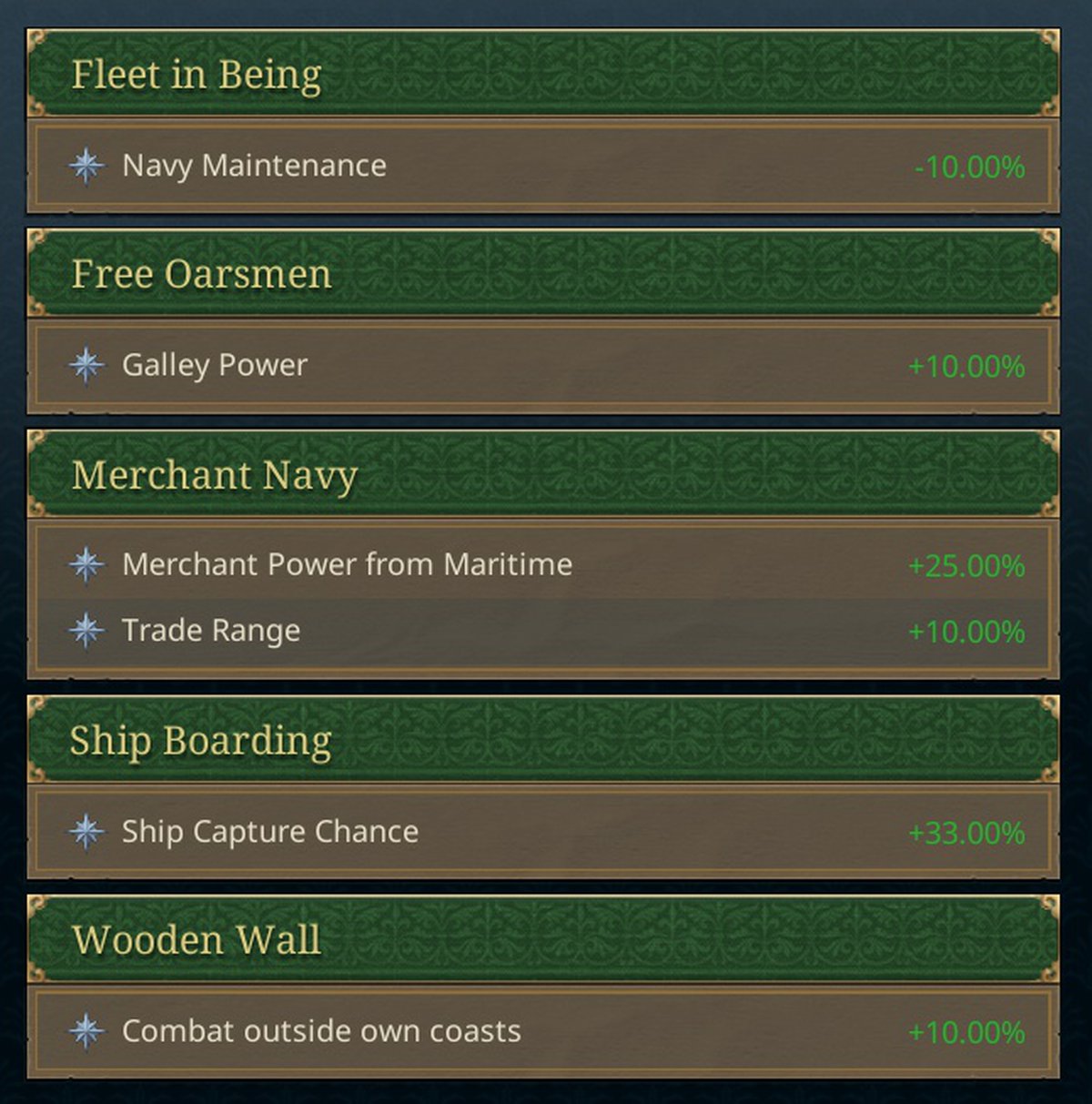 Есть и военно-морская доктрина. Можно сосредоточиться на абордаже, понизить стоимость содержания флота или вообще сделать ставку на купцов. В военно плане последний вариант не сильно полезен, но торговая дистанция и сила коммерсантов вырастет.