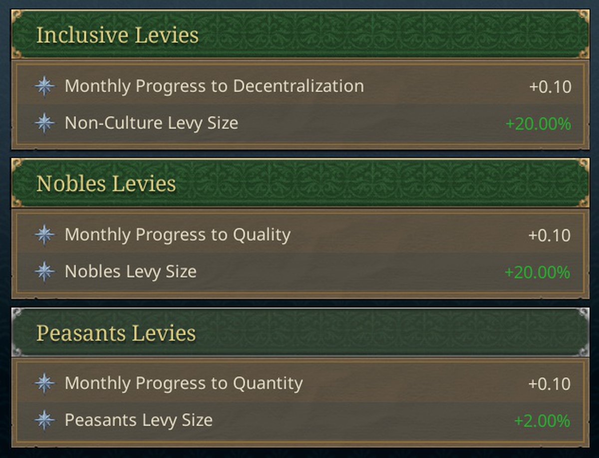 Разработчики очень хотят сделать, чтобы разные варианты не просто давали какие-то бонусы и штрафы, а чтобы влияли на доступность механик, действия сословий и общественные ценности. В пример ставят закон о рекрутах.