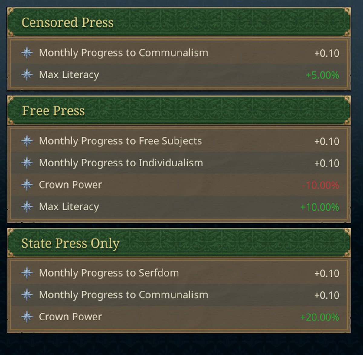 Интереснее выглядит закон о свободе прессы. Можно ввести полную цензуру, позволить сословиям делать СМИ или ничего не ограничивать. Это уже будет влиять на то, куда общество движется: к индивидуализму, крепостному праву, местному самоуправлению. А ещё и на грамотность населения.