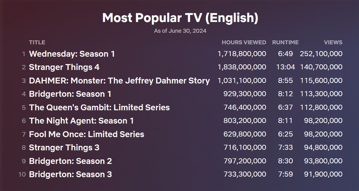 Суммарно «Бриджертоны» набрали на Netflix свыше 2.46 миллиарда часов просмотров и почти 300 миллионов просмотров за первый 91 день после выхода. Первое место в топе все еще занимает «Уэнсдэй» с 252 миллионами просмотров за 91 день.