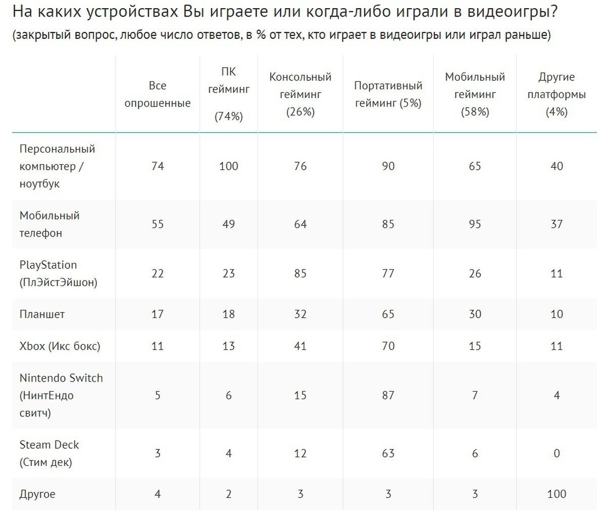 - В основном игроки используют два устройства. Самые популярные это PC или ноутбук (74%) и смартфон (55%).