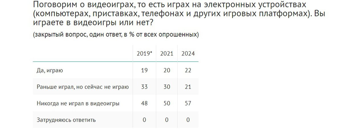 - 22% опрошенных играют в видеоигры. 21% играли, но перестали; о том, почему это произошло, не сообщается.