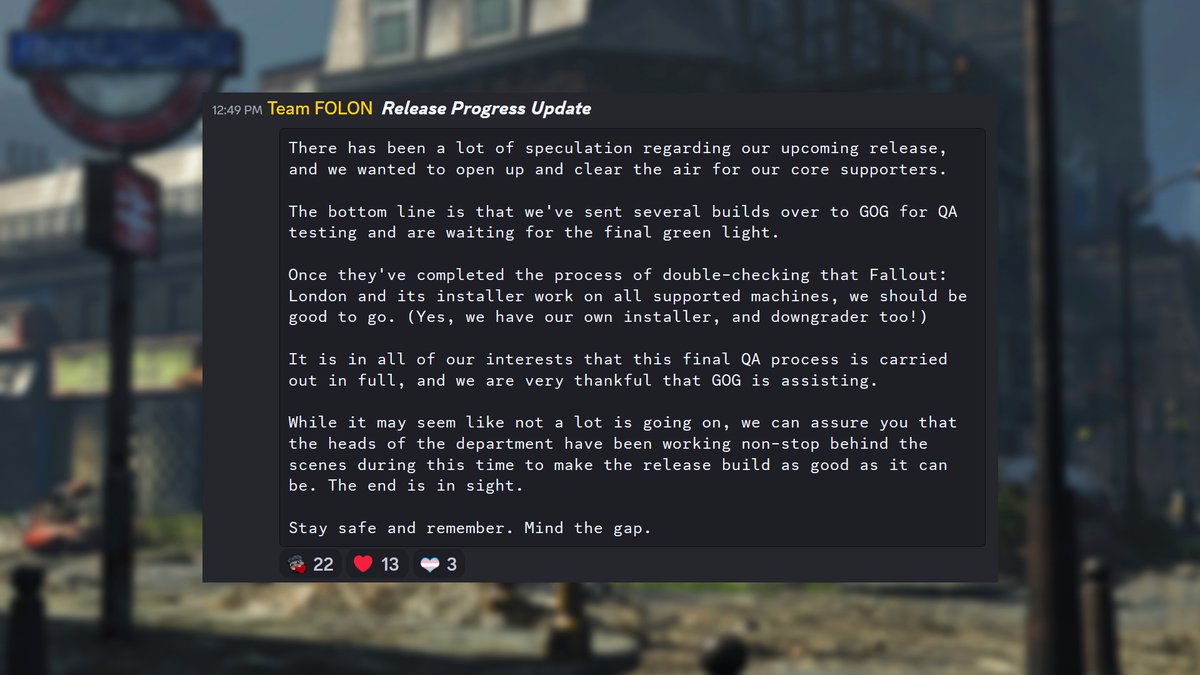 Сейчас, рассказывают создатели Fallout London, команда GOG занимается тестированием нескольких билдов игры. Одновременно тестируется специальный лаунчер Fallout London; его проверяют на «всех поддерживаемых системах».
