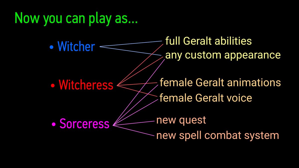 Для игроков, решивших поиграть за ведьмачку или волшебницу, моддер подготовил женскую версию голоса Геральта и анимации, адаптированные под женские модели. У волшебниц есть бонус: новая боевая система на основе магии и новое задание.
