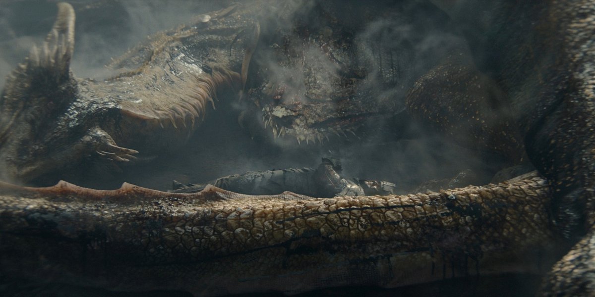 Пилот из Эймонда такой же плохой, как и король. Дракон Рейнис без особых проблем дает отпор противнику, но тут выясняется, что здоровенная Вхагар, дракон Эймонда, знает толк в маскировке — ей удается удивить Рейнис, вынужденную сражаться с двумя драконами разом.